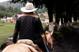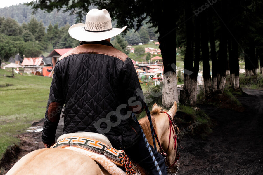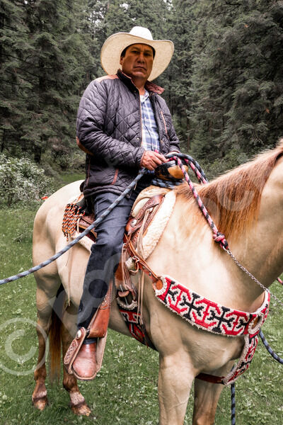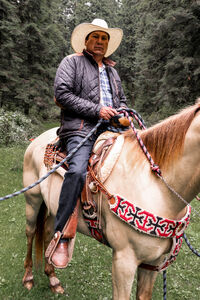 Hispanic man wearing wide-brimmed hat and plaid shirt under puffy jacket looking away riding pale horse in forest during daytime