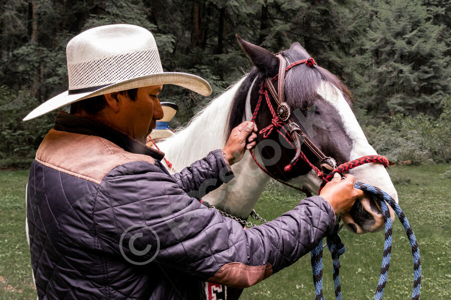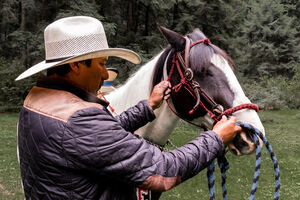 Hispanic man in white hat and quilted jacket adjusts the bridle of horse in forest