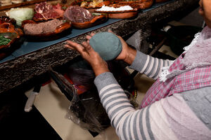 Hands of woman wearing pink apron preparing blue corn tortilla in kitchen at home
