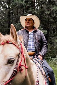 Hispanic man wearing wide-brimmed hat and plaid shirt under puffy jacket looking away riding pale horse in forest during daytime