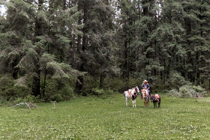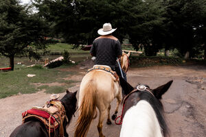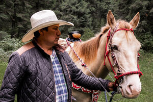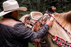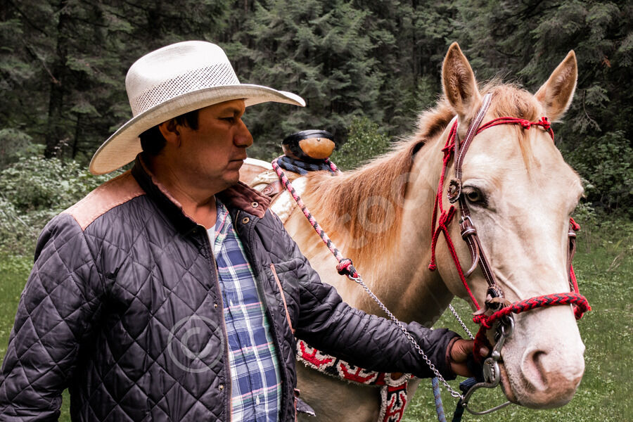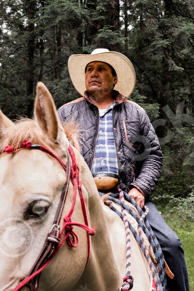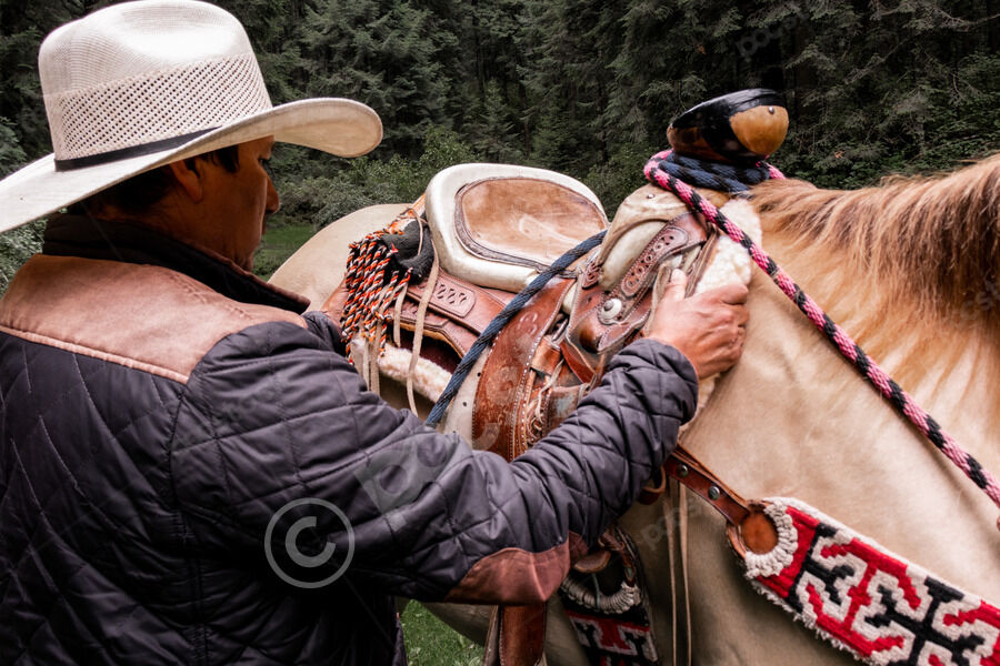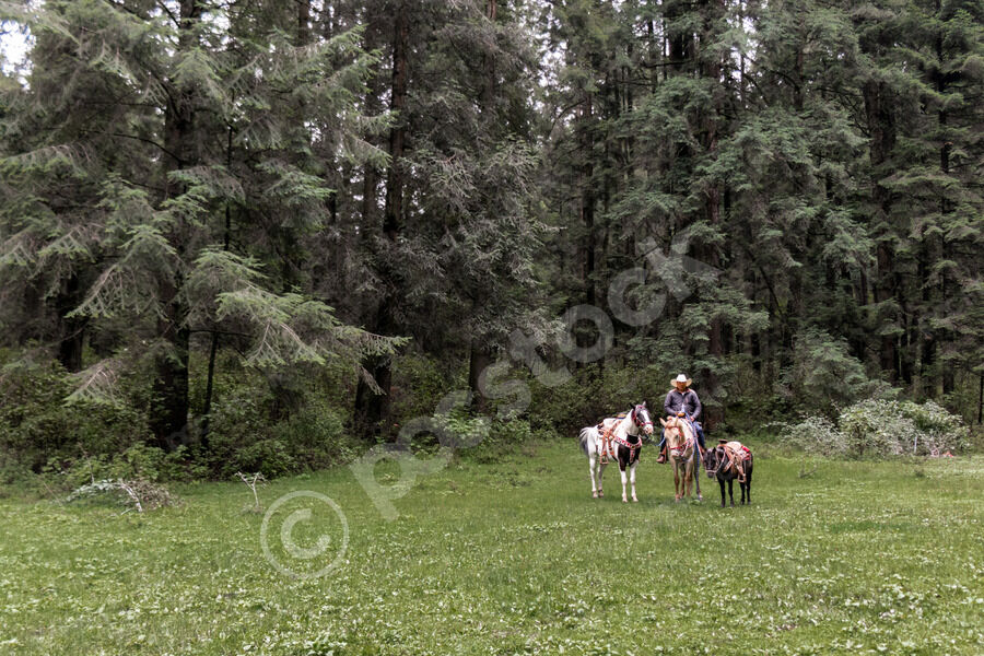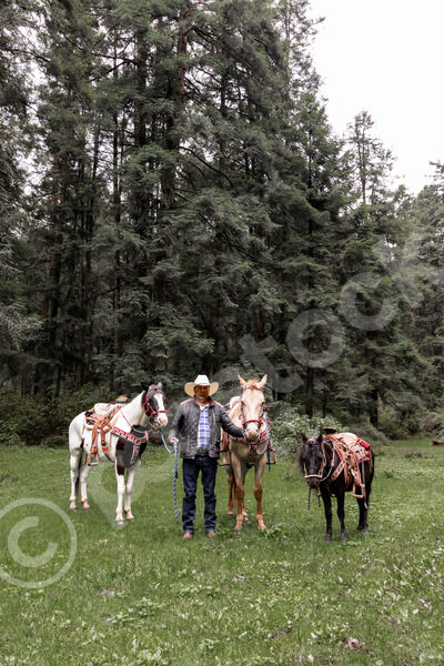Hispanic male wearing cowboy hat and plaid shirt under puffy jacket riding horse with two decorated horses alongside in forest