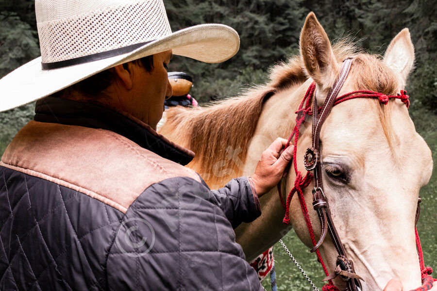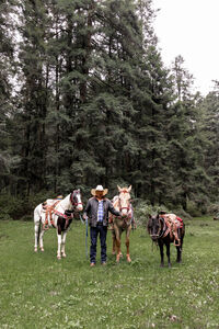 Hispanic man in cowboy hat leading decorated horses in lush green forest during daytime