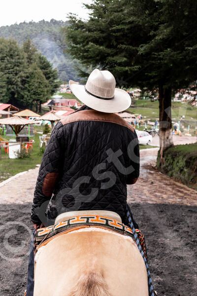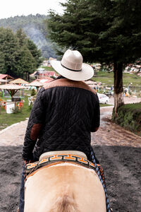 Back view of Hispanic male horseback rider wearing cowboy hat and quilting jacket looking towards park during daytime