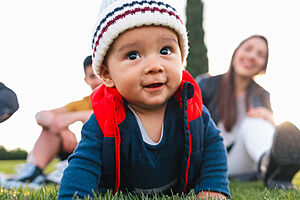 Smiling Hispanic and caucasian lesbian couple in bikinis sitting on pavement and looking at their mixed-race preteen daughter swimming in pool in resort during summer vacation