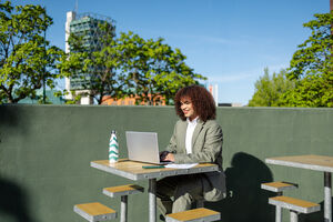 Hispanic trans businesswoman with curly hair working on laptop sitting at table in outdoor cafe on sunny day