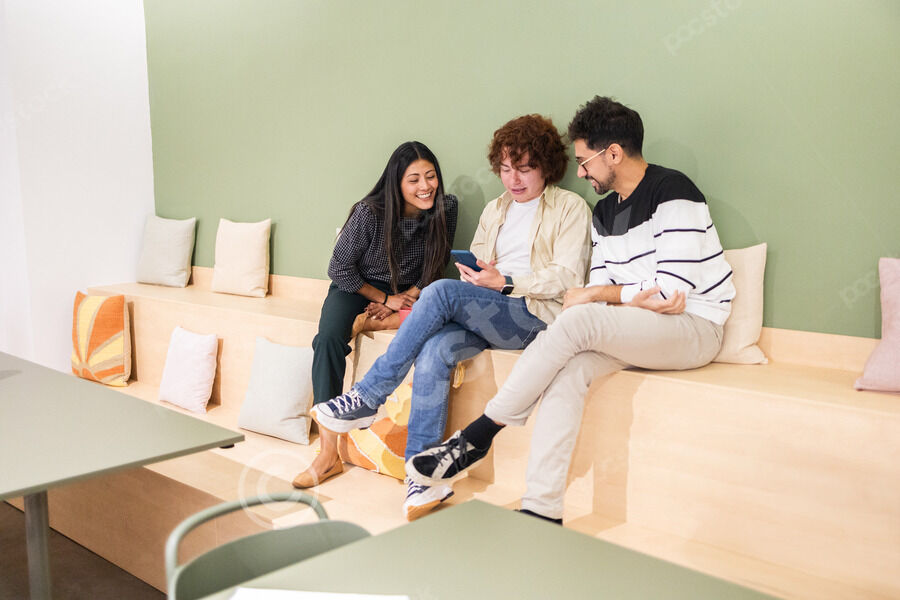 Smiling Hispanic man wearing sunglasses holding smartphone with caucasian boyfriend while standing in front of orange shutter railing in city