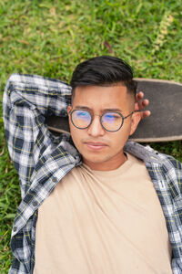 Serious young Hispanic male with long dark hair wearing black suit looking down while standing with crossed arms outdoors during daytime