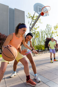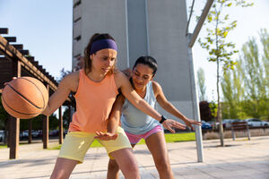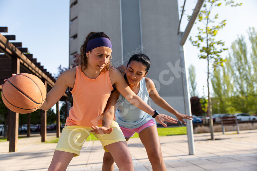 Hispanic and Caucasian women playing street basketball under clear blue sky on sunny day