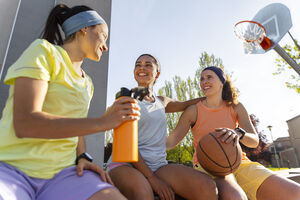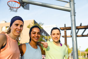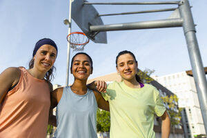 Hispanic woman with arms around shoulders of caucasian female friends standing on basketball court