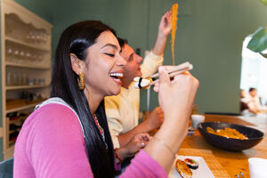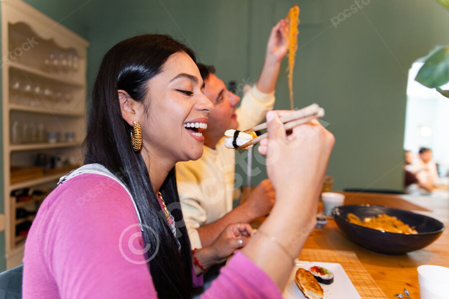 Hispanic girlfriend with chopsticks sitting at table with caucasian boyfriend in restaurant