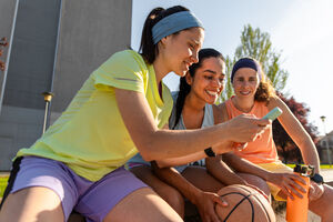 Hispanic woman holding basketball while Caucasian female friend shows smartphone sitting in park on sunny day