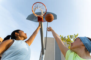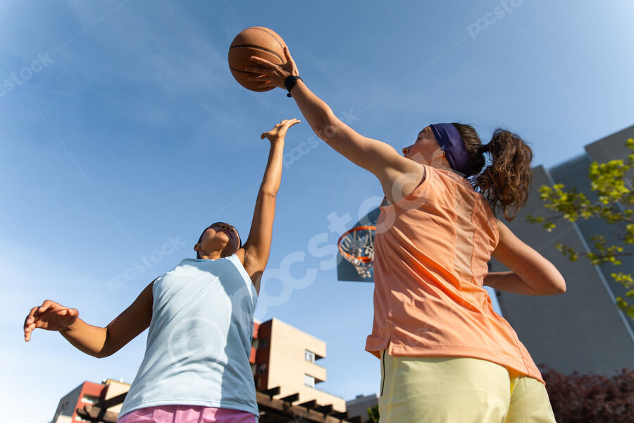 Hispanic and Caucasian women playing street basketball under clear blue skies