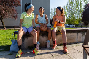 Hispanic and Caucasian female friends talking after basketball game sitting on bench in park on sunny day