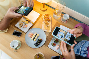 Hispanic woman using smartphone taking pictures of sushi rolls and dumplings while sitting at table in restaurant