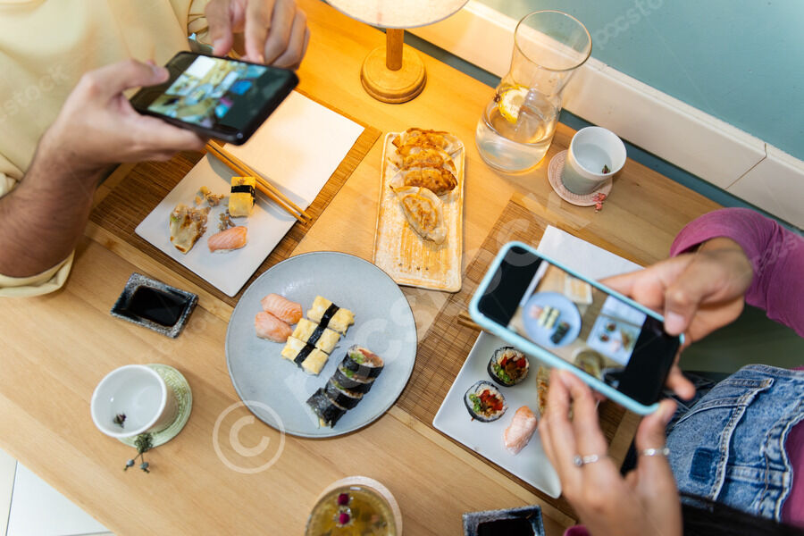 Hispanic and caucasian couple using smartphones taking pictures of sushi rolls and dumplings while sitting together at table in restaurant