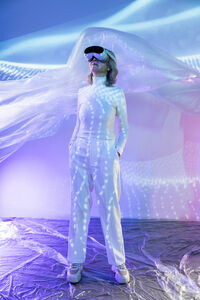 Asian woman wearing futuristic glasses standing against wall with neon lights indoors
