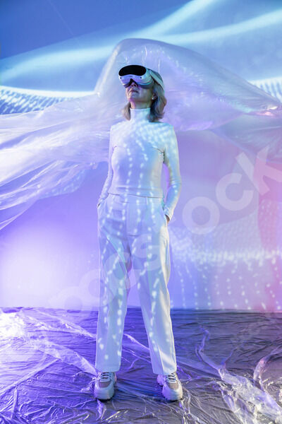 Asian woman engaging with digital interface while standing in studio with neon lights