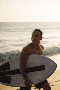 Shirtless Hispanic male surfer looking away and holding skimboard while standing on beach at sunset