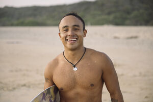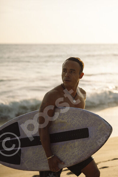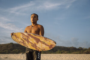 Smiling shirtless Hispanic male surfer holding skimboard while standing on beach at sunset