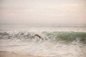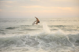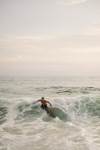 Shirtless Hispanic male surfer surfing on waves with skimboard in ocean at sunset