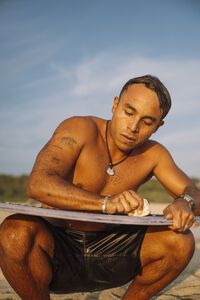 Shirtless Hispanic male surfer putting wacx on skimboard while crouching on beach at sunset