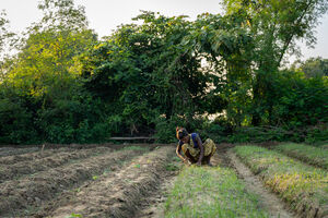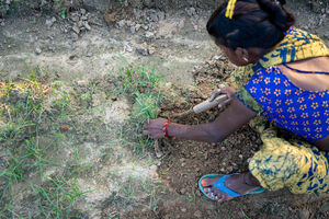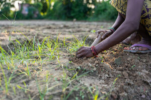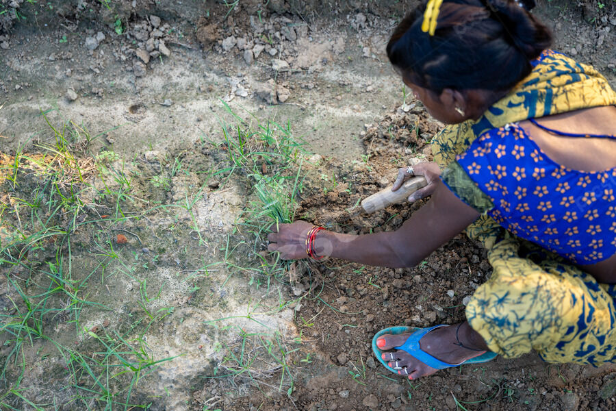 Cropped image of Indian woman in traditional clothing crouching and sowing plants in dry field on sunny day