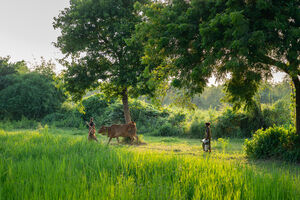 Indian women in traditional clothing herding cow and working in green field on sunny day