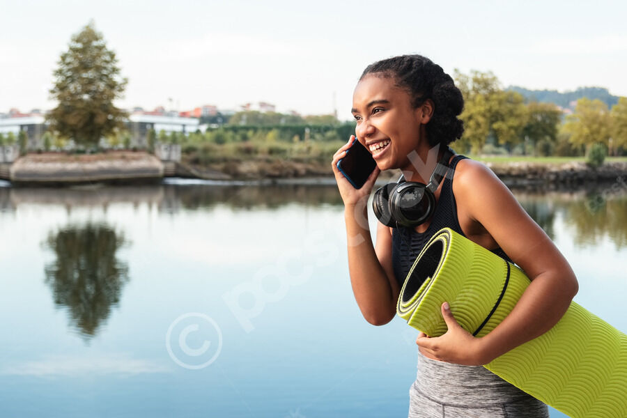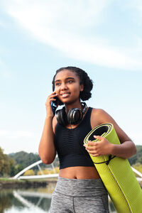 Mixed-race woman with headphones on neck having phone call looking away and holding yoga mat while standing near lake in park during daytime