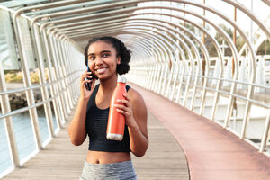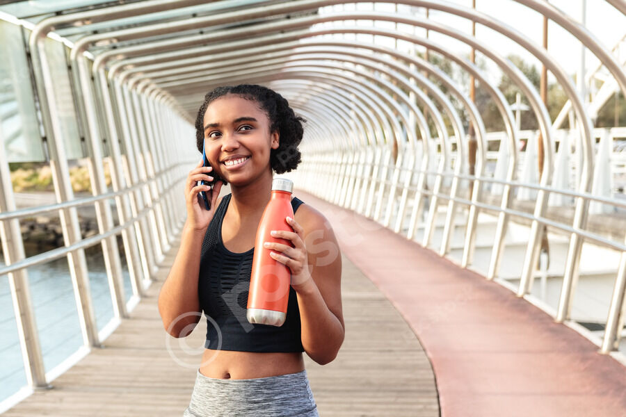 Mixed-race woman wearing sportswear having phone call looking away holding tumbler while standing on footbridge during daytime