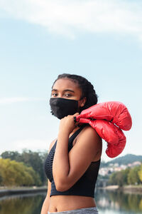Mixed-race woman wearing face mask holding boxing gloves while standing near lake in park during daytime