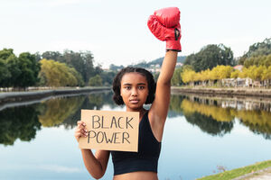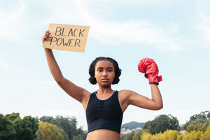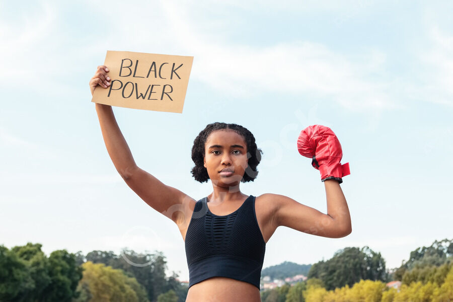 Mixed-race woman wearing boxing glove holding placard with Black Power text flexing muscles while standing in park