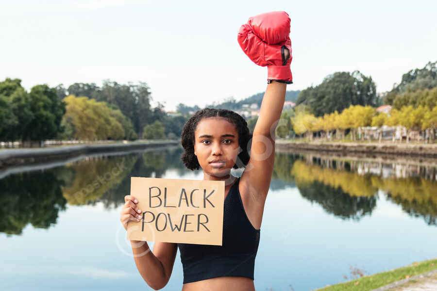 Mixed-race woman wearing boxing glove raising arm holding placard with Black Power text while standing near lake in park