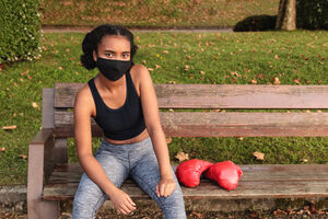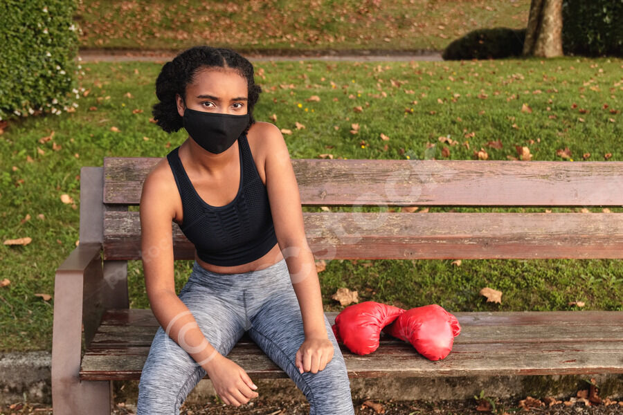 Mixed-race woman wearing face mask sitting on wooden bench with boxing gloves in park during daytime