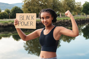 Mixed-race woman holding placard with Black Power text flexing muscles while standing near lake in park