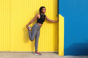 Mixed-race woman with headphones on neck wearing sportswear stretching leg looking away while standing and leaning on blue and yellow colorful wall outdoors on sunny day
