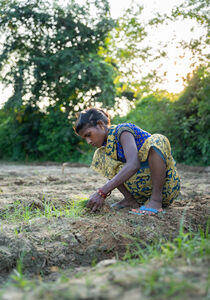 Indian woman in traditional clothing crouching and sowing plants in dry field on sunny day
