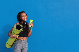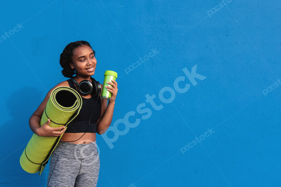 Mixed-race woman with headphones on neck wearing sportswear looking away holding yoga mat and tumbler while standing against blue wall outdoors