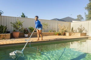 Hispanic middle-aged woman in blue blouse cleaning the pool using pool skimmer in the backyard on a sunny day