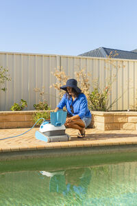 Hispanic middle-aged woman in denim shorts and sun hat setting up automated pool cleaner crouching beside pool in backyard on a sunny day