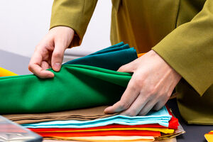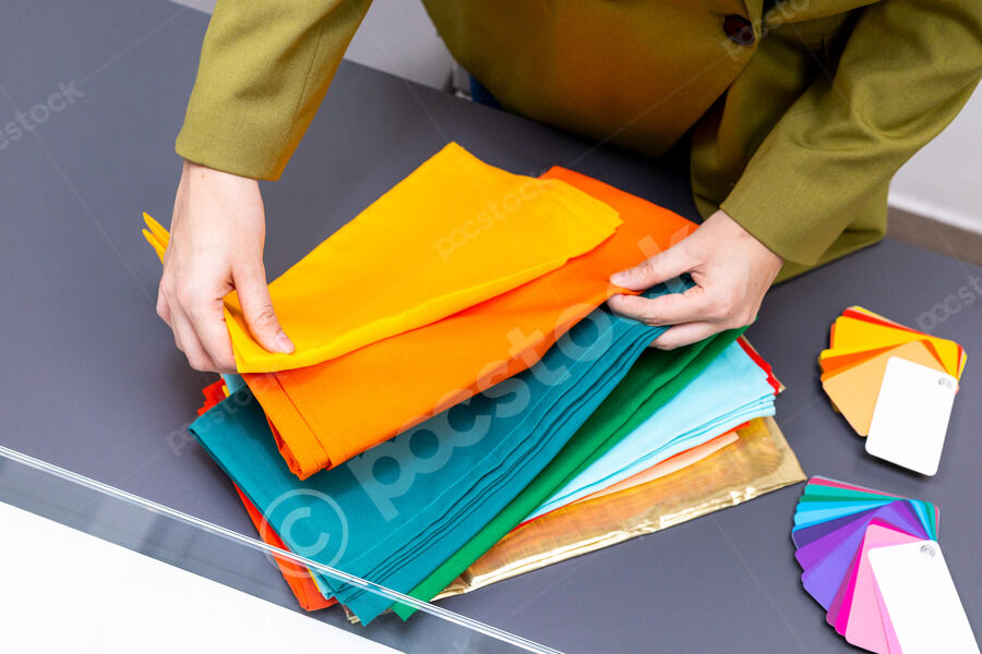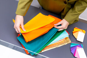 Hispanic female designer arranging fabric swatches sitting at table in office