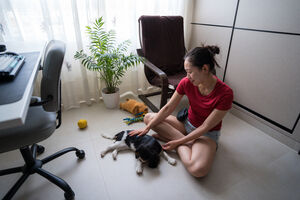 Chinese woman playing with her dog while sitting with crossed legs on floor at home