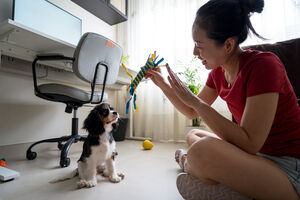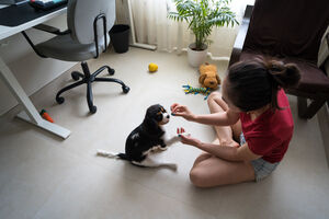 Chinese woman training her dog while sitting with crossed legs on floor at home