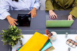 Hispanic businesswomen working on tablet and laptop sitting at table in office