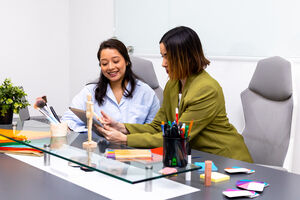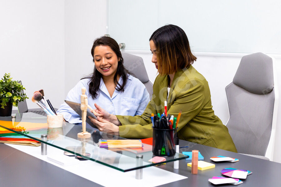 Hispanic female consultant showing tablet to female client sitting at table in office