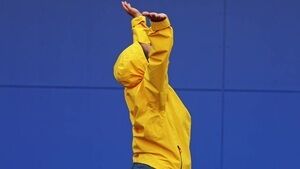 Hispanic woman wearing yellow raincoat raising arms enjoying rainy day against blue wall outdoors