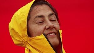 Hispanic woman wearing yellow raincoat looking up against red wall outdoors