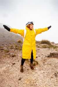 Hispanic female hiker wearing yellow raincoat spreading arms standing on rugged terrain on rainy day