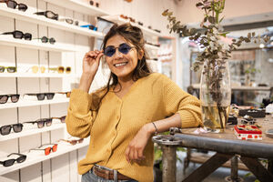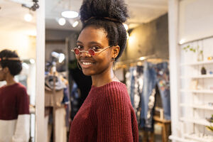 Black woman in maroon sweater and sunglasses smiling while standing in an eyewear boutique