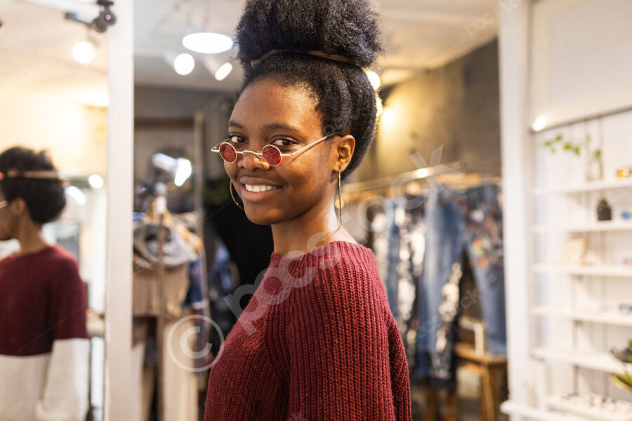 Black woman in red and white sweater trying on sunglasses and looking at the mirror while standing in eyewear boutique