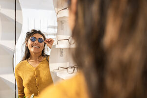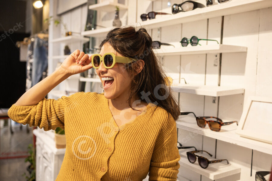 Hispanic woman in mustard sweater trying on sunglasses and laughing looking away while standing in an eyewear boutique